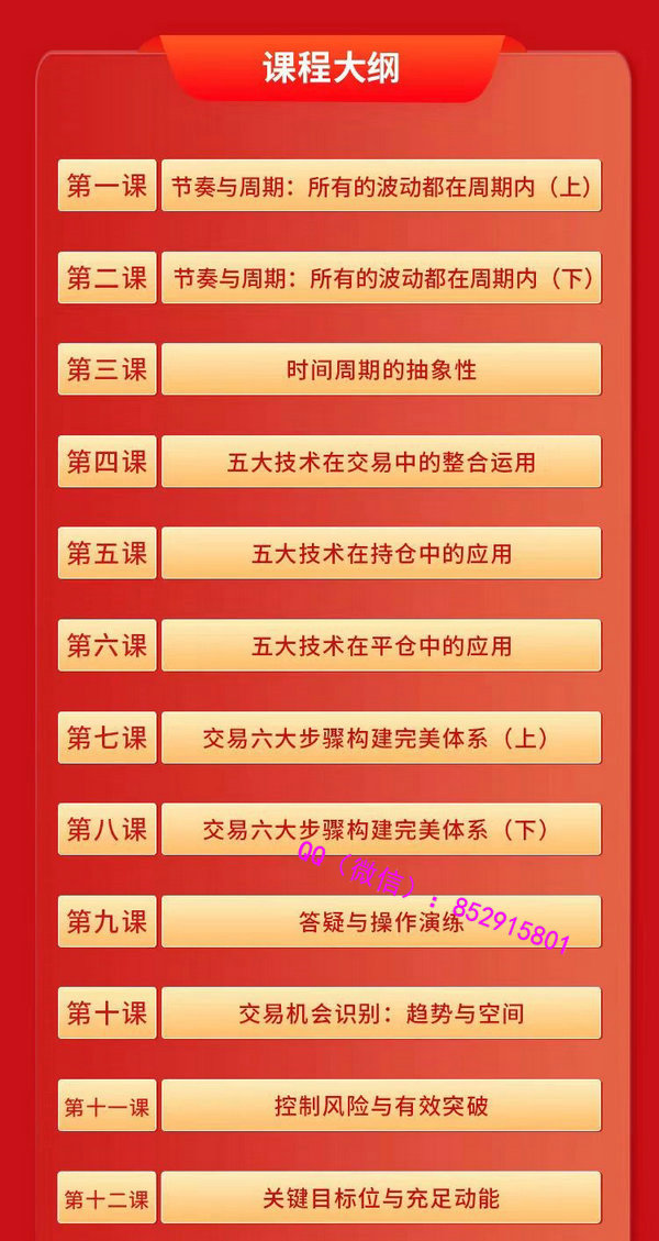 王思俊,多品种资深交易员。拥有多年交易员培训经验。擅长短线/波段交易和多套交易体系。 课程目录: 第一节:节奏与周期:所有的波动都在周期内(上) 第二节:节奏与周期:所有的波动都在周期内(下) 第三节:时间周期的抽象性 第四节:五大技术在交易中的整合运用 第五节:五大技术在持仓中的应用 第六节:五大技术在平仓中的应用 第七节:交易六大步骤构建完美体系(上) 第八节:交易六大步骤构建完美体系(中) 第九节:交易六大步骤构建完美体系(下) 第十节:高概率交易机会识别:趋势与空间 第十一节:控制风险与有效突破 第十二节:关键目标位与充足动能 视频截图: