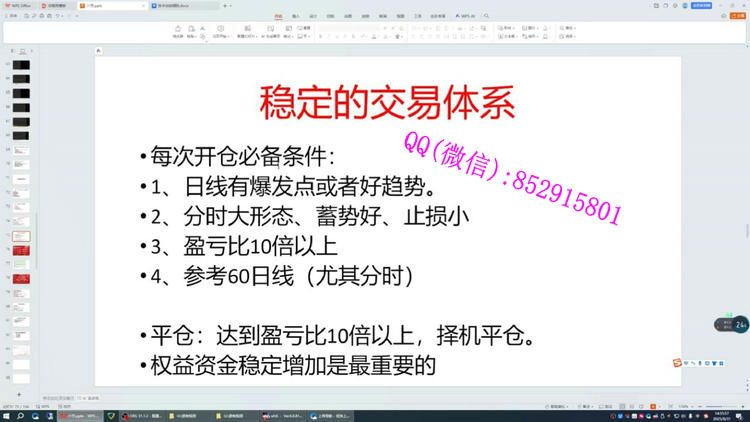 课程目录:01_第一节---韭菜和成功交易员的根本区别02_第二节---详解胜率 盈亏比 以损定量 持仓问题03_第三节---交易要简单纯粹(极其重要)04_第四节---核心交易规则20条05_第五节 ---深度解析K线06_第六节---K线的实战应用07_第七节---技术的核心趋势有效性的判断和波浪理论08_第八节---详细讲解核心技术模型之空前绝后09_第九节---空前绝后的实战应用10_第十节---养成好的交易习惯和成熟体系的建立视频截图: